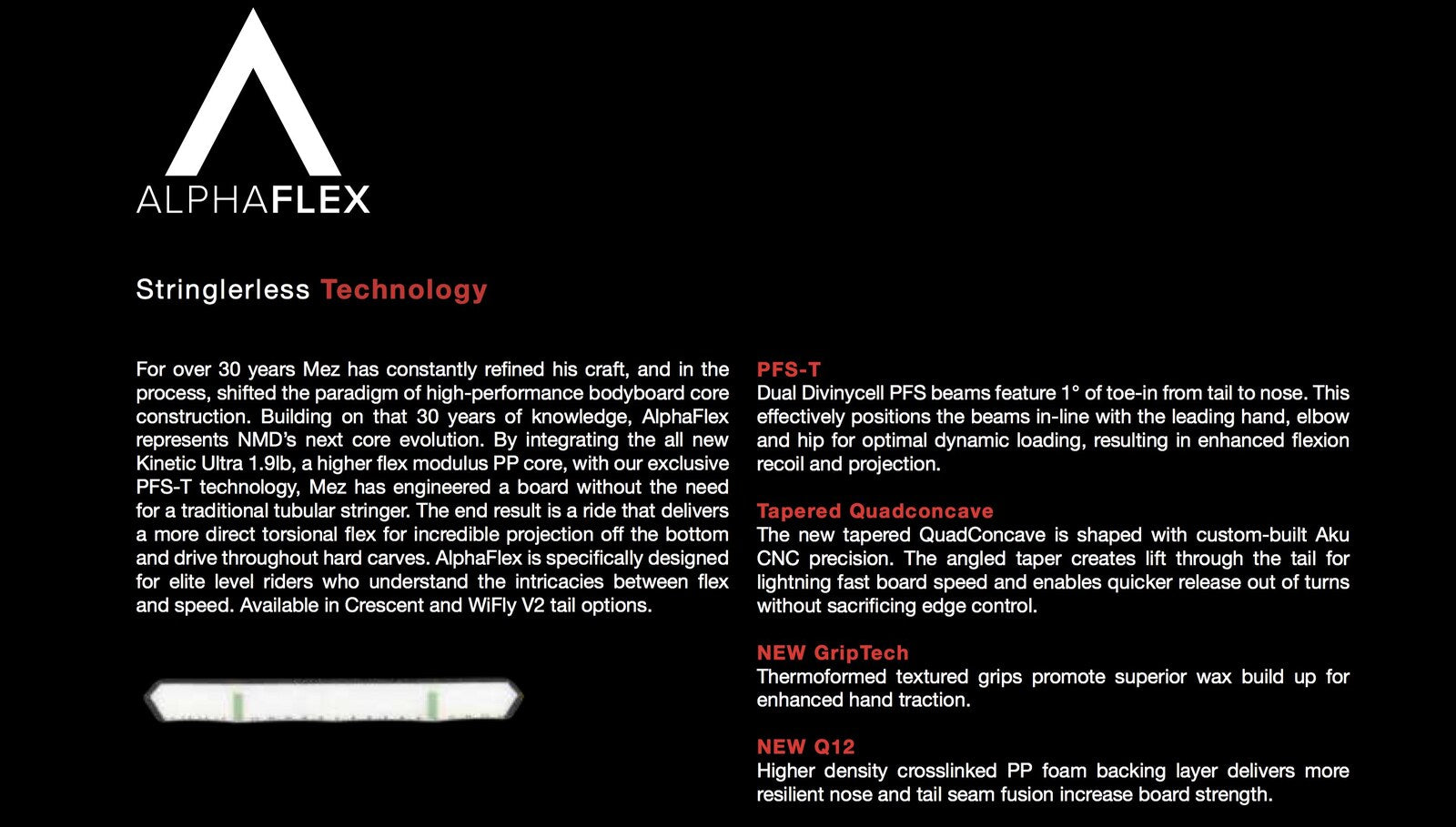 For over 30 years Mez has constantly refined his craft, and in the process, shifted the paradigm of high-performance bodyboard core construction. Building on that 30 years of knowledge, AlphaFlex represents NMD's next core evolution. By integrating the all new Kinetic Ultra 1.9lb, a higher flex modulus PP core, with our exclusive PFS-T technology, Mez has engineered a board without the need for a traditional tubular stringer. The end result is a ride that delivers a more direct torsional flex for incredible projection off the bottom and drive throughout hard carves. AlphaFlex is specifically designed for elite level riders who understand the intricacies between flex and speed.